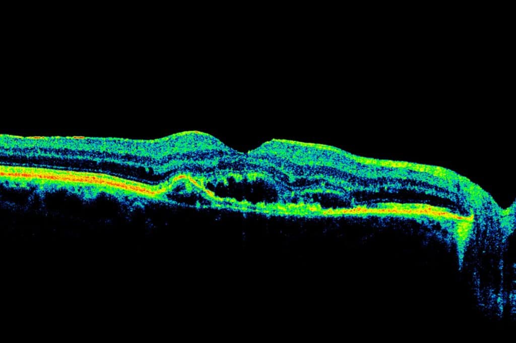 - Optiskās koherences tomogrāfijas izmeklējums (OCT): šajā izmeklējumā tīklene tiek “skenēta” ar lāzera staru palīdzību. Tiek iegūts tīklenes attēls, kurā var konstatēt izmaiņas agrīnā stadijā, piemēram, šķidruma uzkrāšanos. Zemāk esošajos attēlos parādīts, kā izskatās OCT attēls ar veselu tīkleni un tīkleni, ko skārusi VMD.
